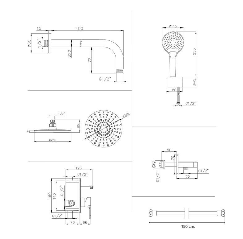 *Tepe duş kolu 40 cm.