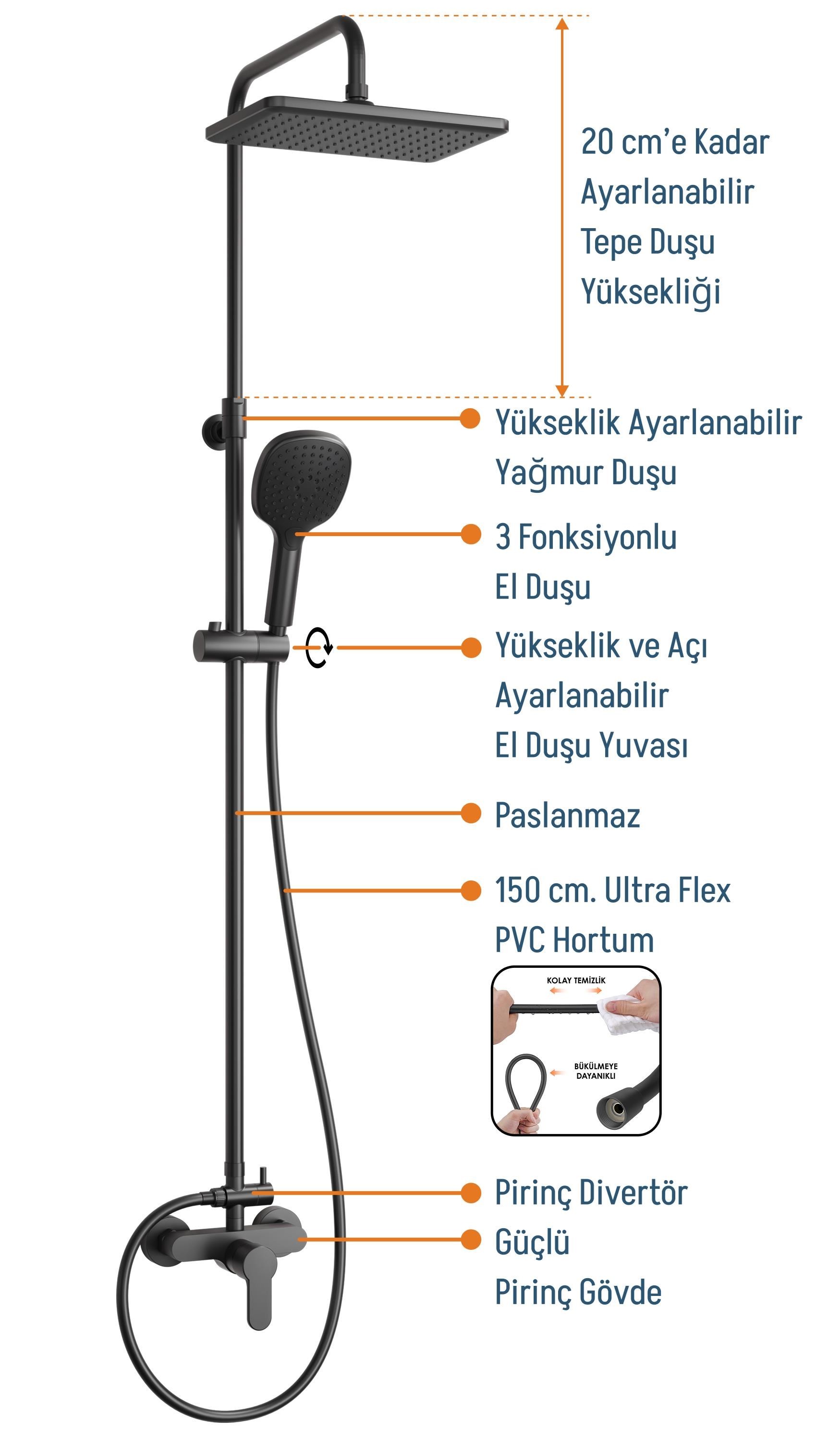 Tepe duşu borus 20 cm.yukarı veya aşağı yükseklik ayarlanabilir.Bu sayede Kullanıcının boyuna veya tavan tüksekliğine göre ayarlama yapılabilir.