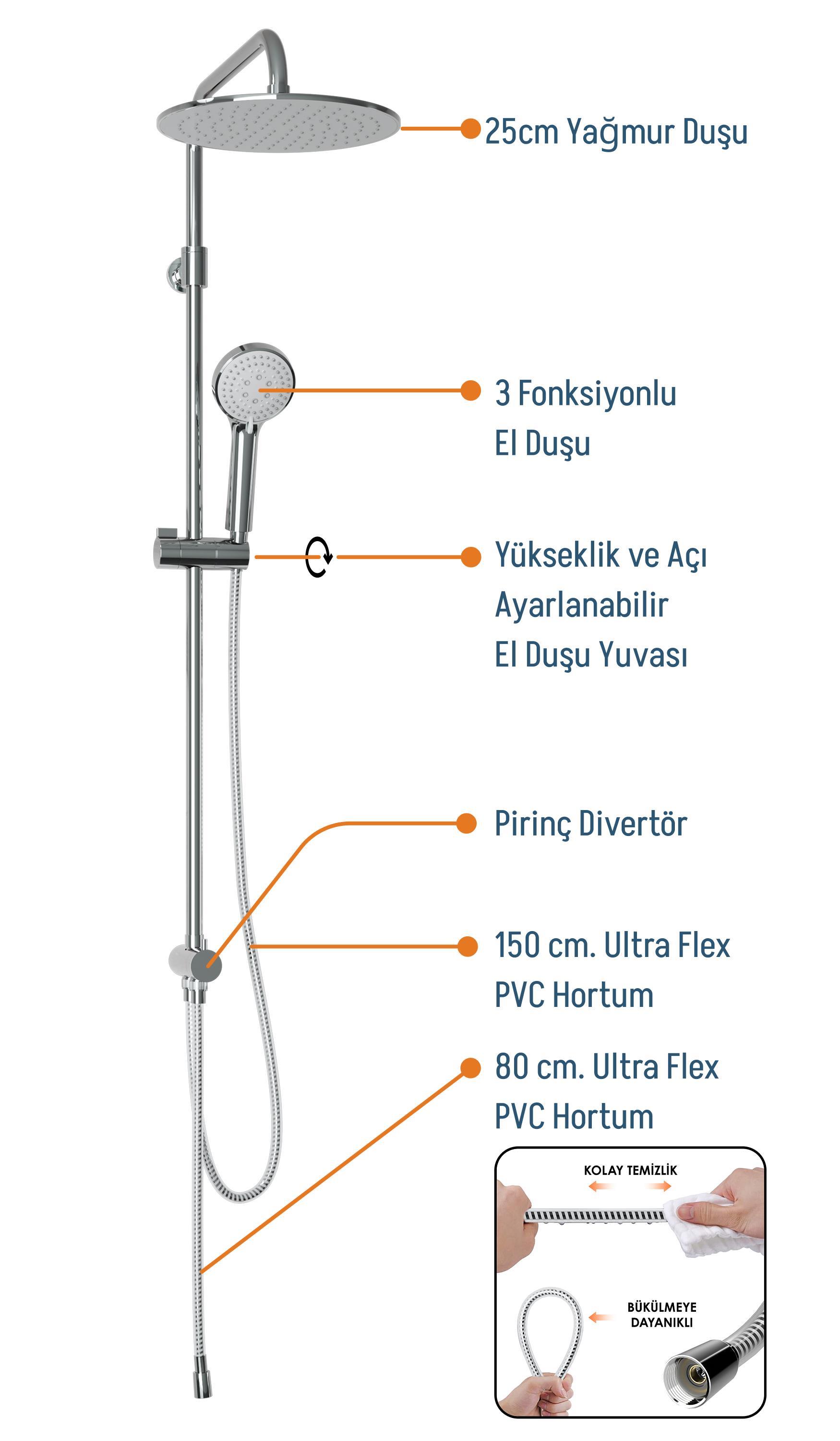 25 cm.tepe duşu ve 3 fonsiyonlu el duşuna sahiptir.
