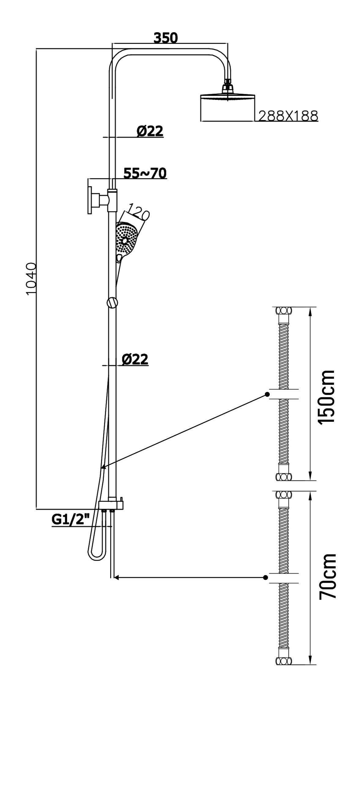Ölçüler: Tepe Duş Başlığı: 25x25 cm / Slider Yüksekliği: 1150 mm / Hortum Uzunluğu: 1500 mm
