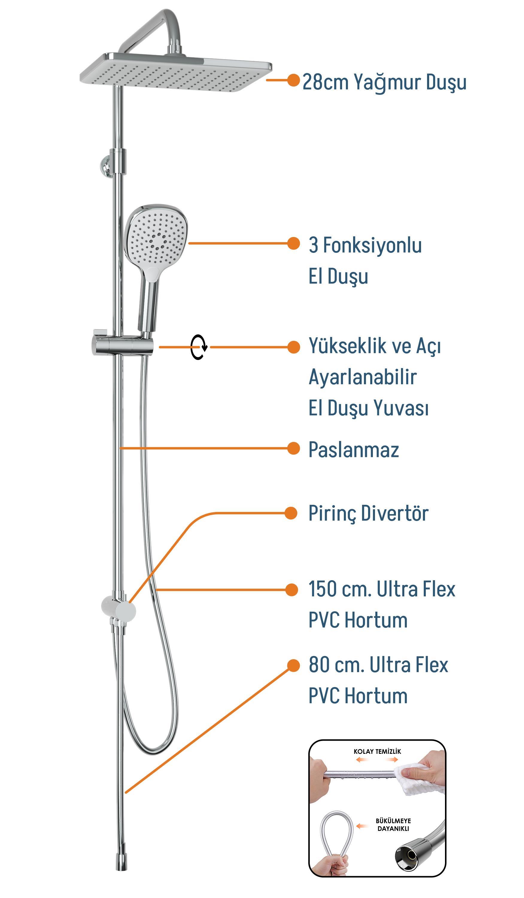 Mekanizma / Tasarım: 3 Fonksiyonlu El Duşu, 40-60 cm Ayarlanabilir Teleskopik Boru, Kireç Kırıcı Sistem