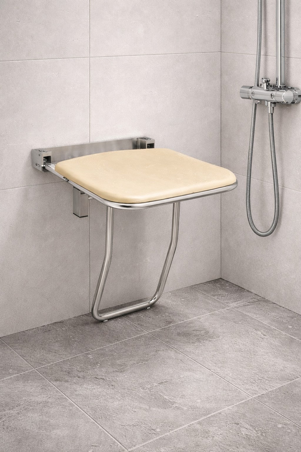 304 kalite paslanmaz çelikten üretilmiş gövdesi sayesinde neme ve suya karşı dayanıklıdır. Bu sayede banyo, duş alanı ve tuvalet gibi tüm ıslak hacimlerde uzun ömürlü kullanım sağlar. Oturak kısmı dayanıklı plastik malzemeden üretilmiştir ve kullanıcıya hijyenik ve konforlu bir oturma alanı sunar.