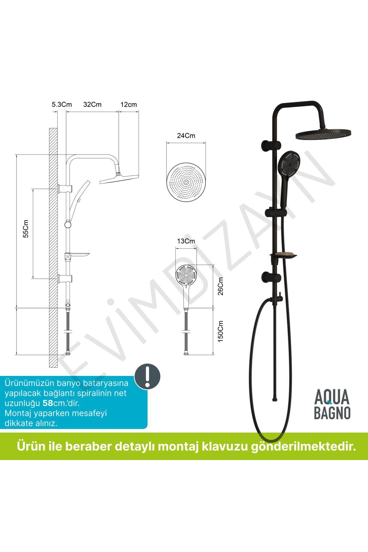 Aqua Bagno Largo tepe duşu seti; banyonuzda güvenle ve uzun yıllar kullanabileceğiniz özel tasarlanmış bir üründür. Aqua bagno tepe duşu sistemleri türkiye' de üretilip ihraç edilmek üzere göre üretilmiştir. Piyasada çok sayıda bulunan ucuz ama kalite standardı düşük ürünlere göre birçok üstünlüğü vardır. Mat siyah renklidir. Garantilidir; mat siyah renkli aqua bagno Largo tepe duşu seti 2 yıl garantilidir. Garanti süresi bittikten sonra da güvenle uzun yıllar kullanabilirsiniz. Yuvarlak formlu tepe başlığı; 20 cm.Çapındaki tepe başlığı ile aqua bagno tepe duşu tam bir yağmurlama duş keyfi yaşatır. Üstelik hareket edebilen tepe duşu ile suyun akış açısını ihtiyacınıza göre değiştirerek maksimum banyo keyfi yaşarsınız. 2 fonksiyon el duşu ile maximum banyo keyfi; pulse ve jet sprey fonksiyonları ile largo el duş başlığı ile suyu hissederek maksimum banyo keyfi yaşarsınız. Uçları tıkanmaz; sahip olduğu özel tasarımıyla tepe ve el duş başlıkları su çıkış uçları parmaklarınızla kolayca temizlenir . Özellikle sıcak suya bağlı kireçlenme nedeniyle tıkanmalar ortadan kolayca kaldırılır. Patlamaz , Sızdırmaz ;Tepe duşu ve el duşu özel güçlendirilmiş yapısıyla 5 bara kadar basınca ve 70 dereceye kadar sıcaklığa dayanır. Ultra esnek-Kırılmaz , Burkulmaz; aqua bagno largo da kullanılan duş spiralleri, çift kenetli paslanmaz metal gövdesi sayesinde ultra esnek ve kırılmaya karşı ekstra dayanıklıdır. 20 kg. Ağırlığa kadar dayanabilir. 360 derece dönebilen bağlantı parçası burkulmaz ve kolay kullanım sağlar. Paslanmaz;Ürünün gövdesi duş spiralleri (plastik harici ) tüm parçaları pirinç veya paslanmaz metalden üretilmiş olup paslanmama özelliğine sahiptir. Metal yönlendirici :Pirinç metalinden den mamul edilmiş gövdesi ile fonksiyonel kullanım. Hareketli sabunluk; hareket edebilen yapısıyla sabunluk fonksiyonel bir bekletme alanı oluşturarak sizlere kolaylık sağlar.