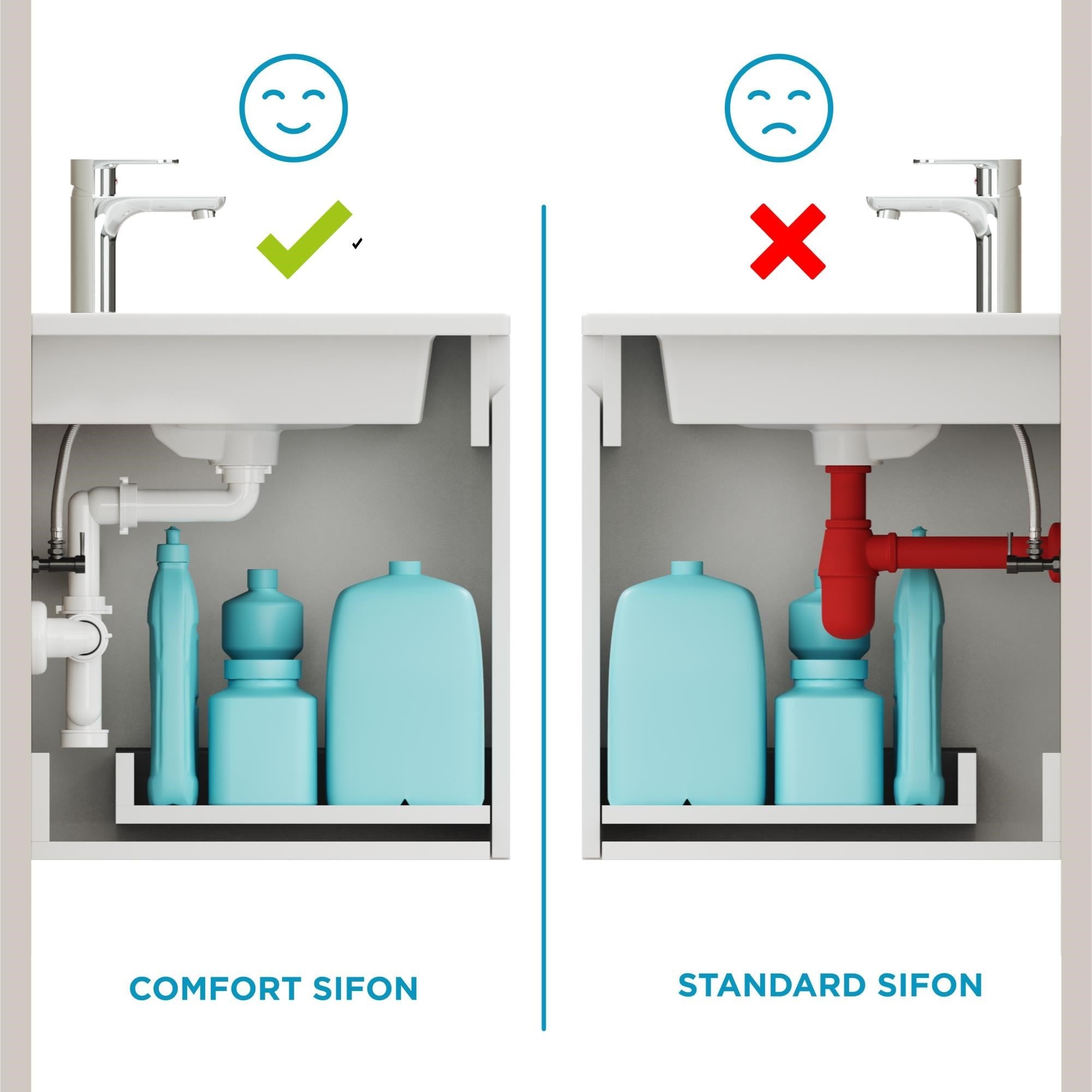 Comfort yer kazandıran lavabo sifonu ,360 derece dönebilen tasarım esnek kurulum sağlar ve yerden tasarruf sağlar. Gider borusu kolayca istenen açıya döndürülebilir ve istenen uzunlukta kesilebilir.