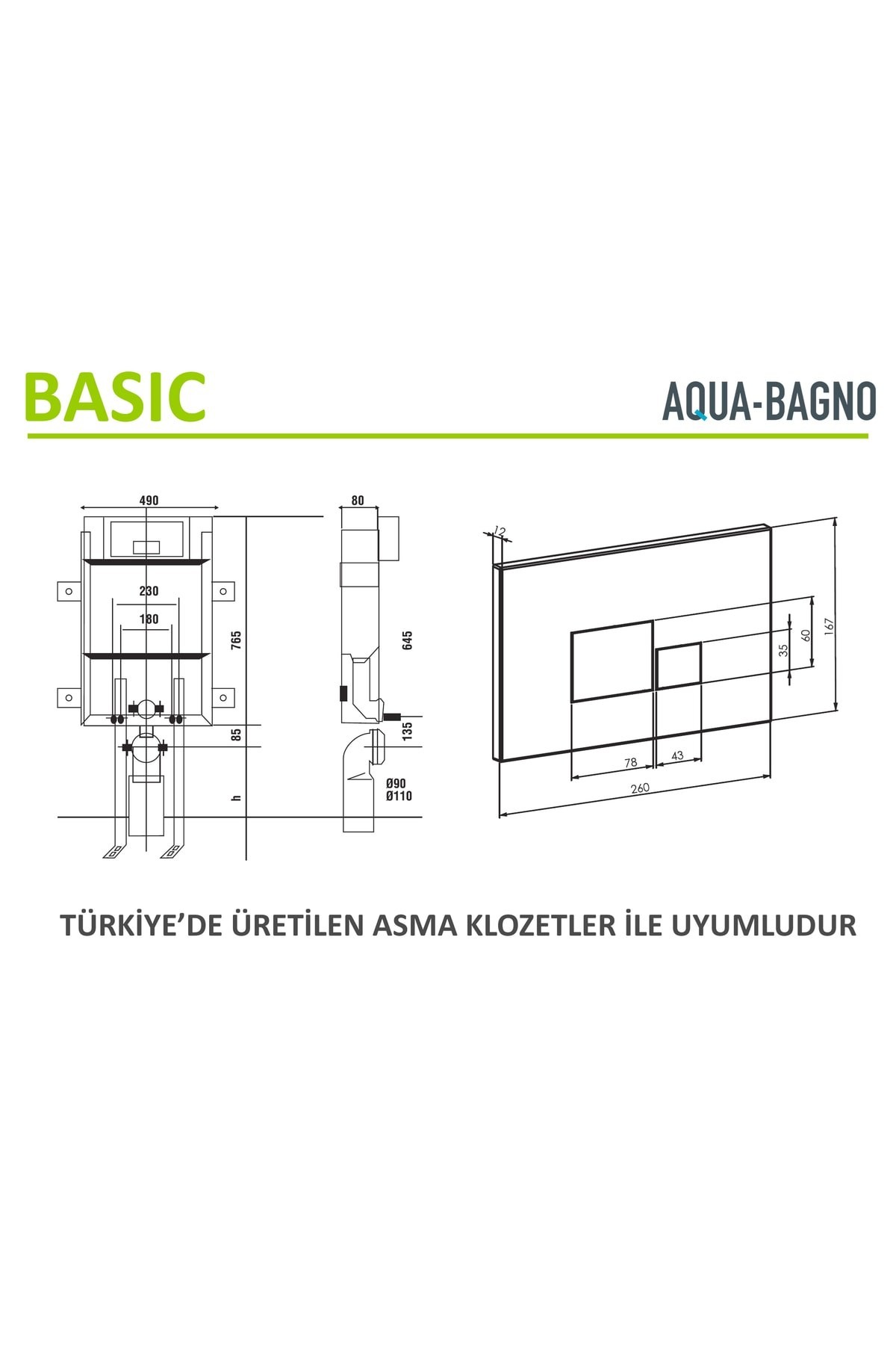 AQUA BAGNO Basic Gömme rezervuar, gövde ve Mat Siyah Basma butonu olmak üzere 2 parça halinde satılan güvenle kullanacağınız bir üründür. Markamız tüm Avrupa'da satılmaktadır. Tüm üretim süreçleri TSE ve CE standartlarına uygun olarak gerçekleştirilmiştir. Ürünler, AQUA BAGNO markası için Türkiye'de üretilmekte ve ihraç edilmektedir. Ürünler, galvaniz kasalıdır ve 400 kg taşıma kapasitesine sahiptir. Çift basma butonu sayesinde su tasarrufu sağlar ve terlemeyi önleyen strafor kaplıdır. Piyasada satılan Geberit, Grohe ve Serel gibi gömme rezervuar setleri ile aynı teknik özelliklere sahiptir. Türkiye ve Avrupa standartları dikkate alınarak üretilmiş olup, uzman bir tesisatçı tarafından kolayca montaj yapılabilir. Türkiye’de üretilen ve ithal edilen tüm asma klozetler ile uyumludur. Ürünlerle birlikte tüm montaj aparatları gelmektedir. Ürünlerimiz 2 yıl garantilidir ve garanti süresi fatura tarihi itibariyle başlar.