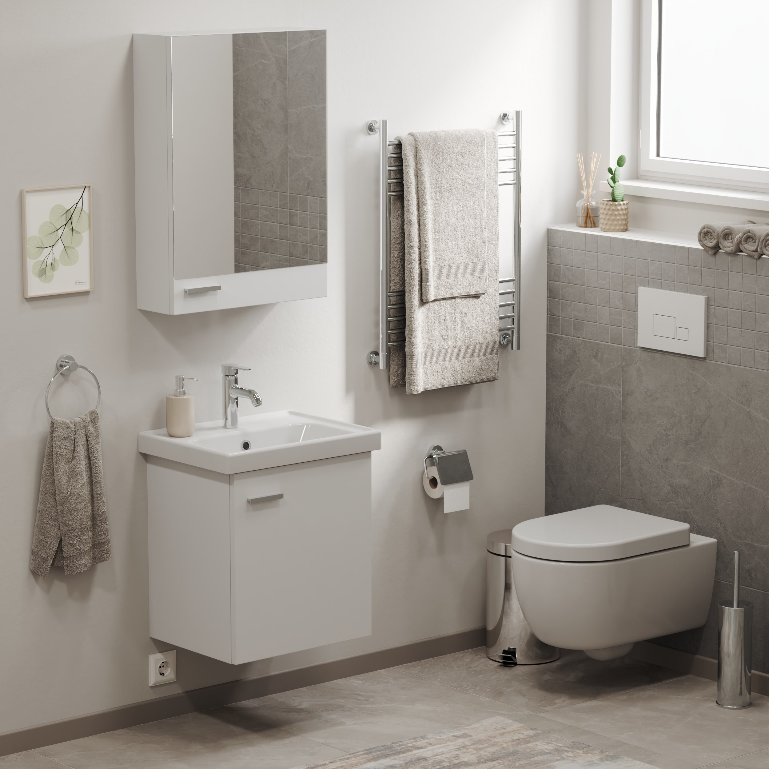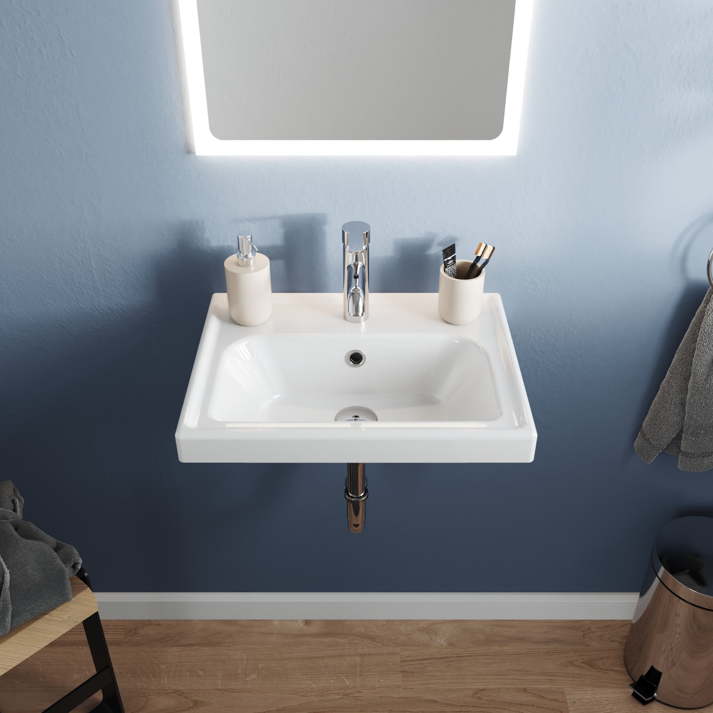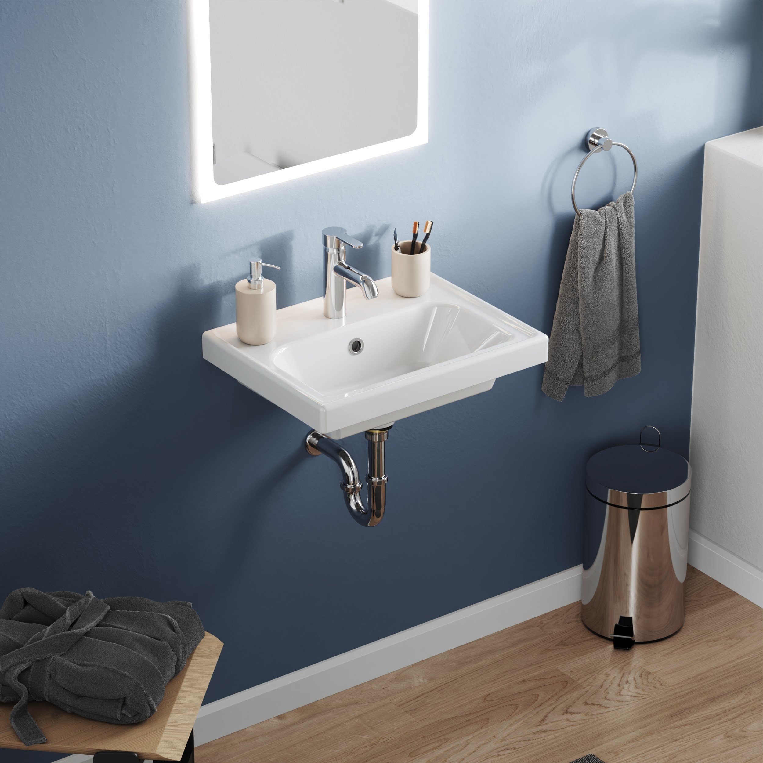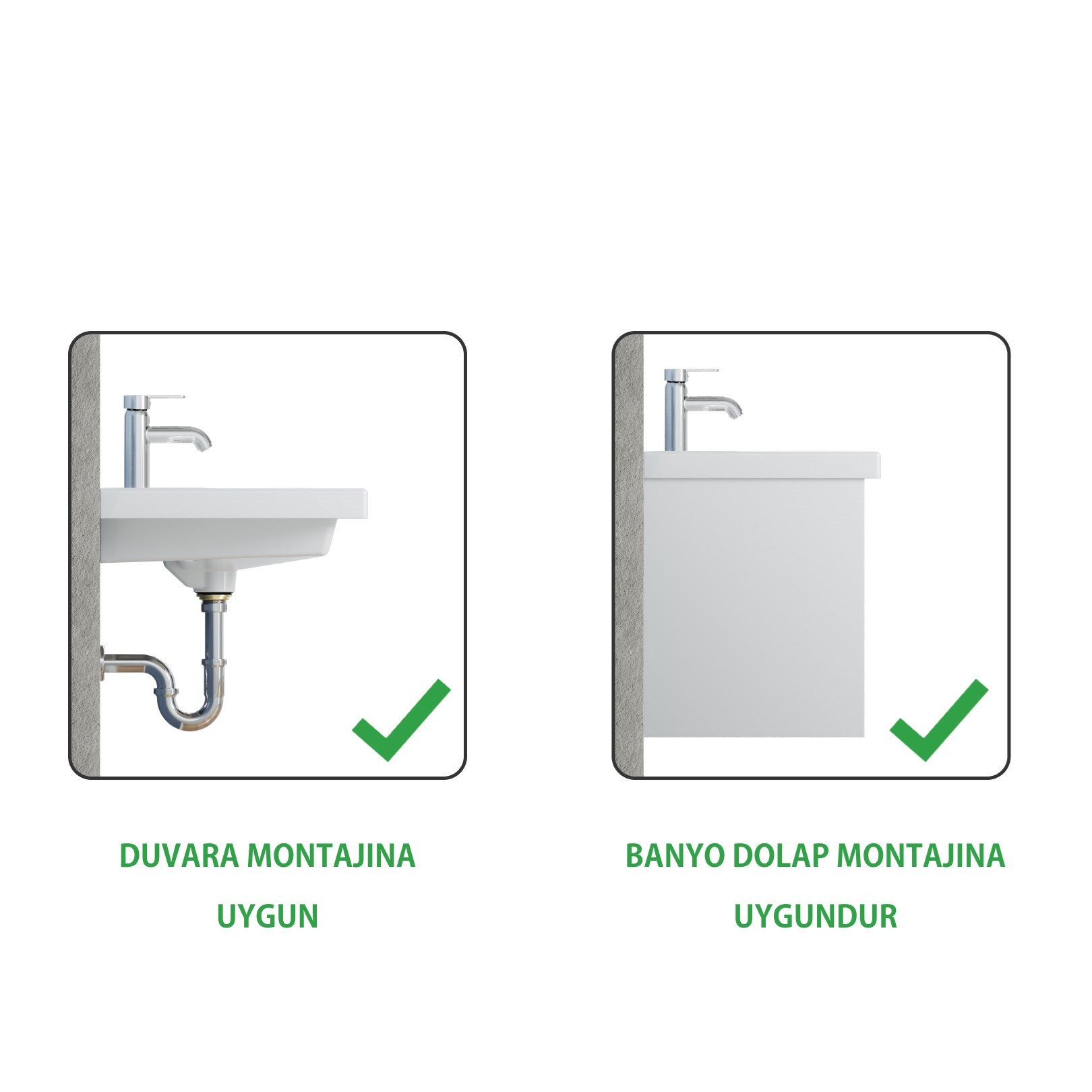 Banyo dolaplarıyla uyumlu olarak tasarlanan lavabo, isteğe bağlı olarak tek başına duvara montaj yapılacak şekilde de kullanılabilir. Ancak ürün, daha önce farklı lavabolar için üretilmiş alt dolaplarla uyumlu değildir; banyo dolabının bu ürüne göre ölçülendirilmiş olması gerekmektedir.