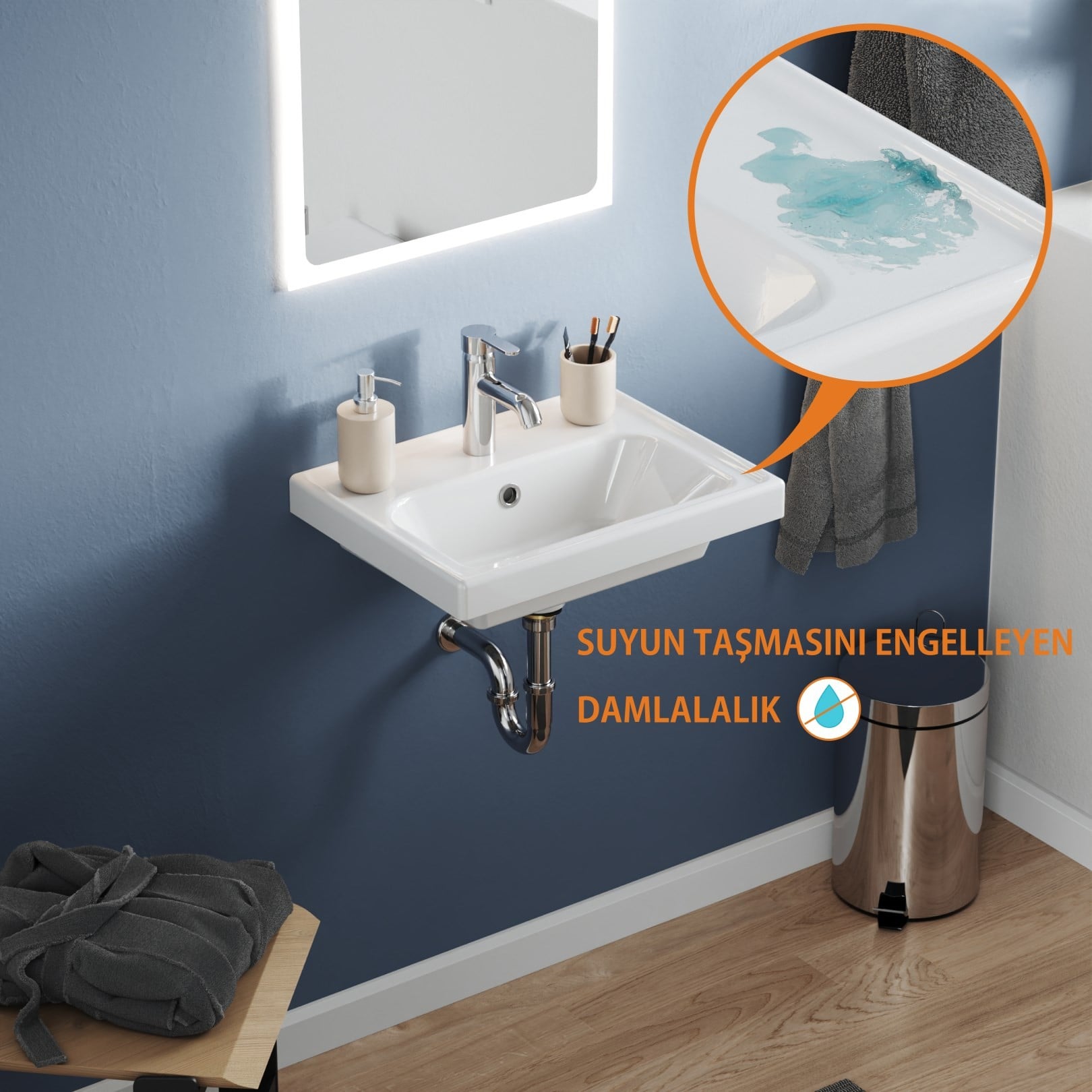 Batarya delikli ve taşma delikli yapısı sayesinde günlük kullanımda pratiklik sunan ürün, tezgah üstü kullanım için uygundur. Kare etajerli tasarımı ile banyo dolaplarıyla estetik bir bütünlük oluşturur. İnce şerit şeklindeki su damlalığı, suyun lavabodan taşarak mobilyaya zarar vermesini önler ve uzun ömürlü kullanım sağlar.