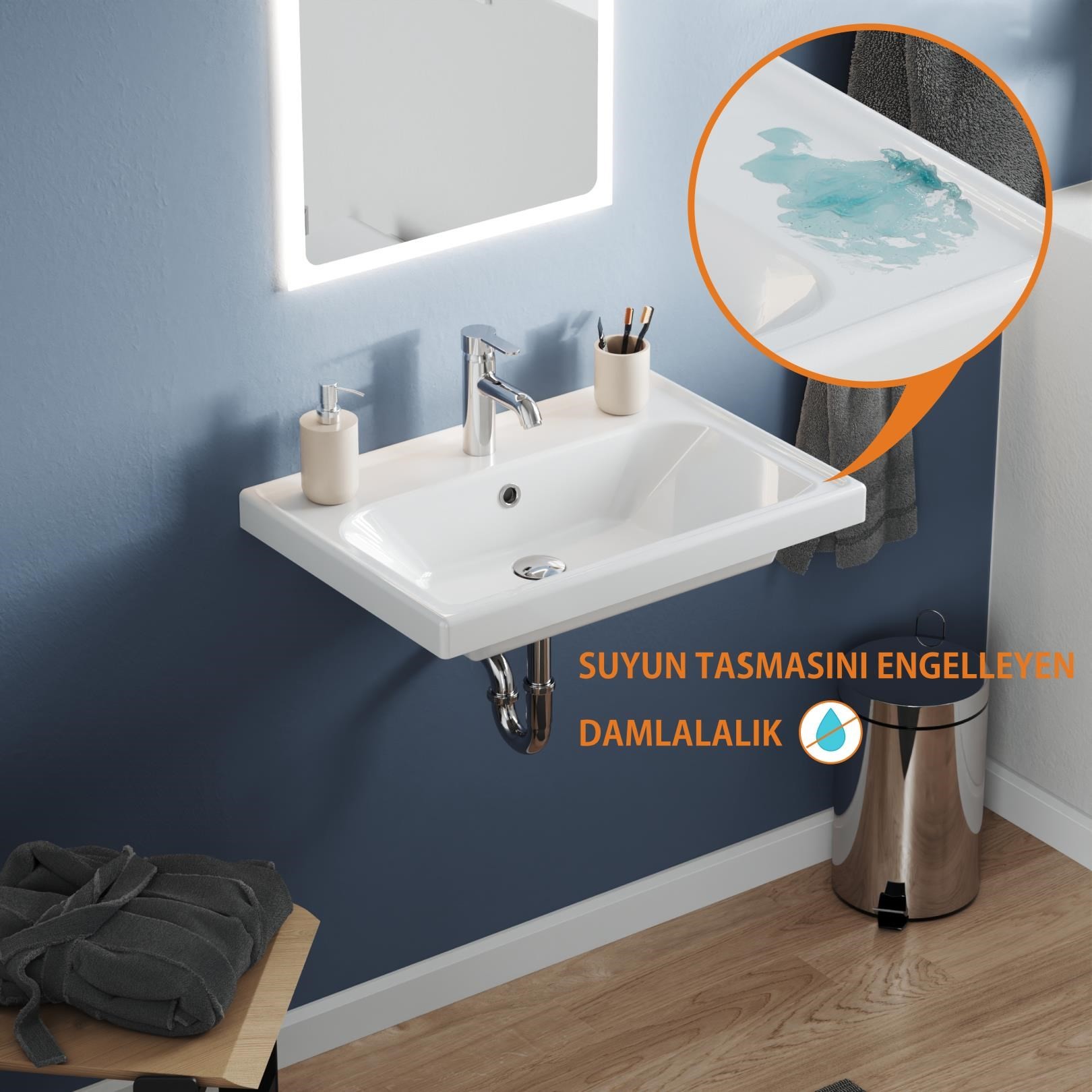 Çevreleyen ince şerit su damlalığı sayesinde suyun lavabodan taşarak mobilyayı ıslatmasını ve bu nedenle mobilyanın zarar görmesini önleyerek kullanım kolaylığı sağlar.